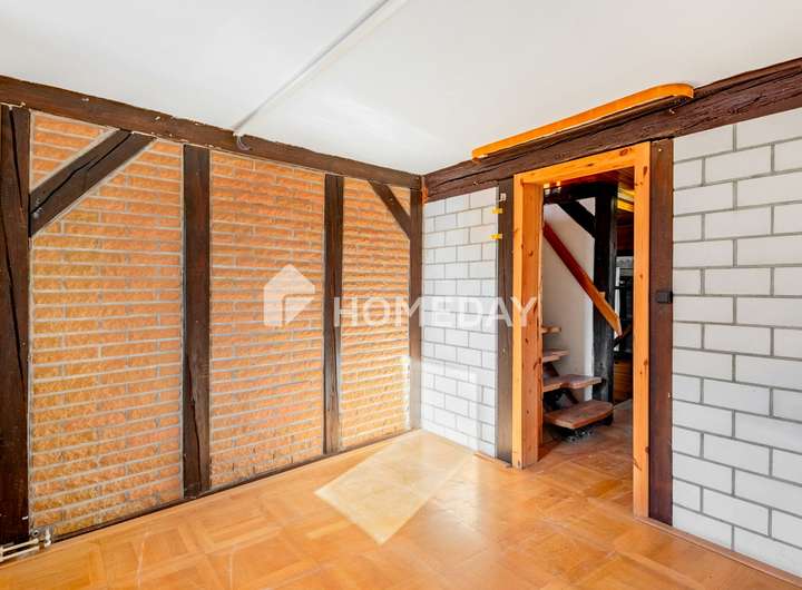 Dieses Wohnhaus, dessen Ursprung zwischen 1750 und 1800 liegt, bildet gemeinsam mit einer später errichteten Scheune sowie einem Anbau aus den 1940er-Jahren ein reizvolles Ensemble mit besonderem Flair. Die Wohnfläche von etwa 75 Quadratmetern verteilt sich auf vier Zimmer, die durch die vielen Schrägen und charmanten Zwischenebenen eine individuelle Raumatmosphäre schaffen. Zwei Räume liegen jeweils eine halbe Ebene höher und sind über kleine Treppen zugänglich, was dem Grundriss zusätzlichen Charakter verleiht.
