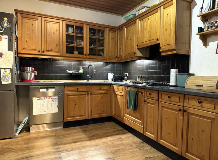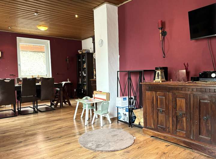 Das Haus bietet eine durchdachte und komfortable Ausstattung, die den Alltag angenehm gestaltet. Im Erdgeschoss befindet sich ein offener Wohn- und Küchenbereich, der durch seine moderne Aufteilung für ein großzügiges Raumgefühl sorgt. Das angrenzende Badezimmer ist mit Badewanne und Dusche ausgestattet. Ein sehr geräumiges Esszimmer bietet Platz für größere Runden und besondere Anlässe.