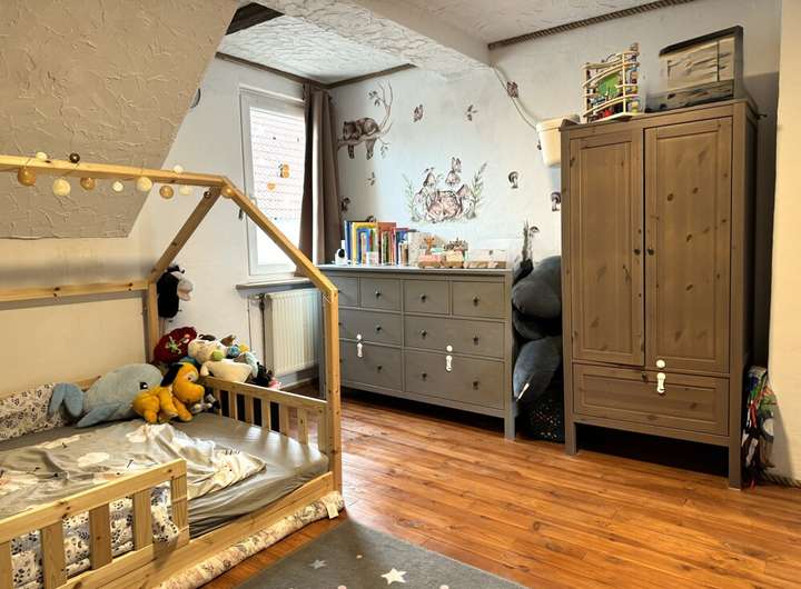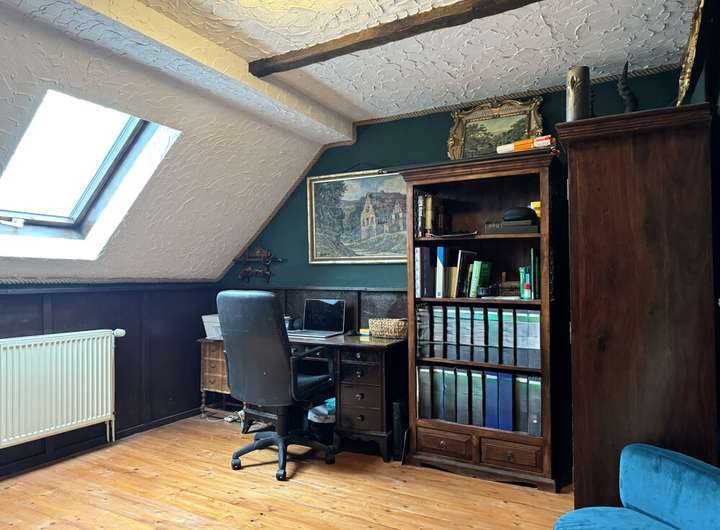 Im Obergeschoss stehen ein gut geschnittenes Schlafzimmer, ein Durchgangszimmer mit idealer Nutzung als Büro sowie ein separates Kinderzimmer zur Verfügung.