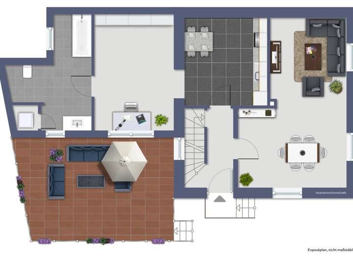 Im Außenbereich lädt die Terrasse mit Grillecke zum Entspannen ein. Der kleine, geschützte Hof ergänzt den Außenbereich perfekt und bietet Platz für gemütliche Stunden im Freien.