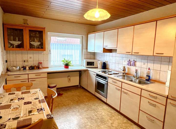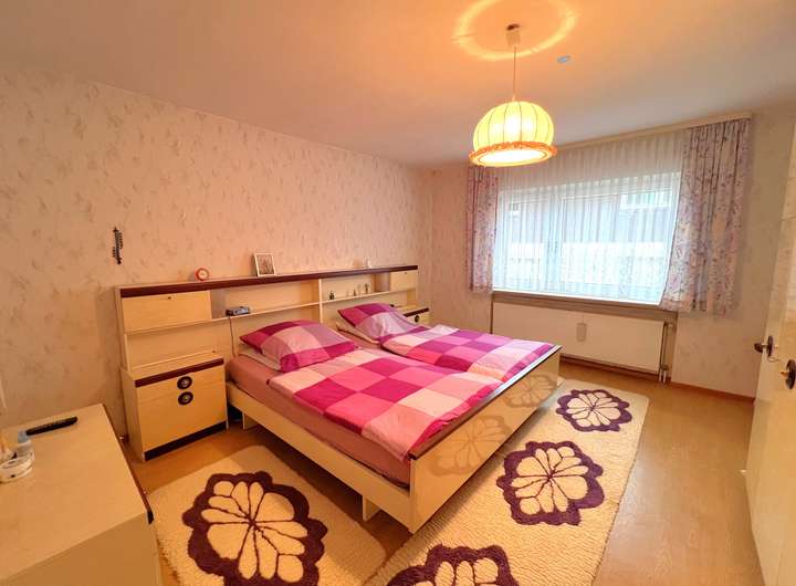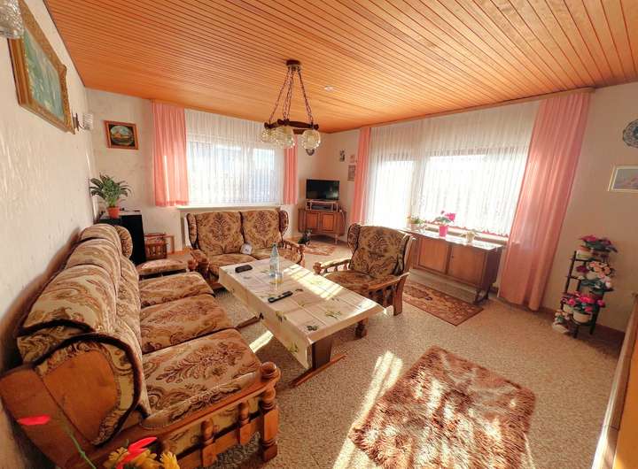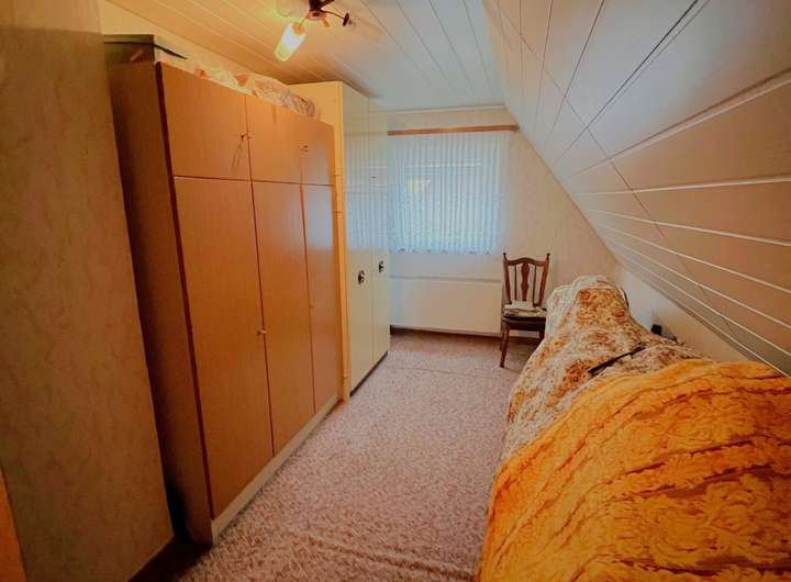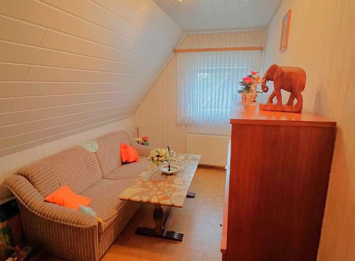 Insgesamt 5 Zimmer, (davon zwei kleine Kinderzimmer im Dachgeschoss), Küche, Bad und ein geräumiger Keller mit einem 24m² großem Hobbyraum, der von der Gartenseite aus begehbar ist.