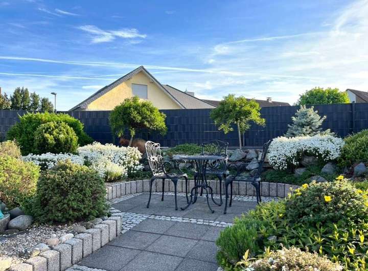 Die Details verraten die Handschrift von Beständigkeit und Qualität: Granitarbeitsplatten in der Küche, hochwertige Einbauschränke, moderne Heiztechnik und elektrische Rollläden verbinden Komfort mit Eleganz. Draußen locken Gartenplätze für stille Morgenstunden und laue Sommerabende, während die Terrasse zum Mittelpunkt gemeinsamer Momente wird.