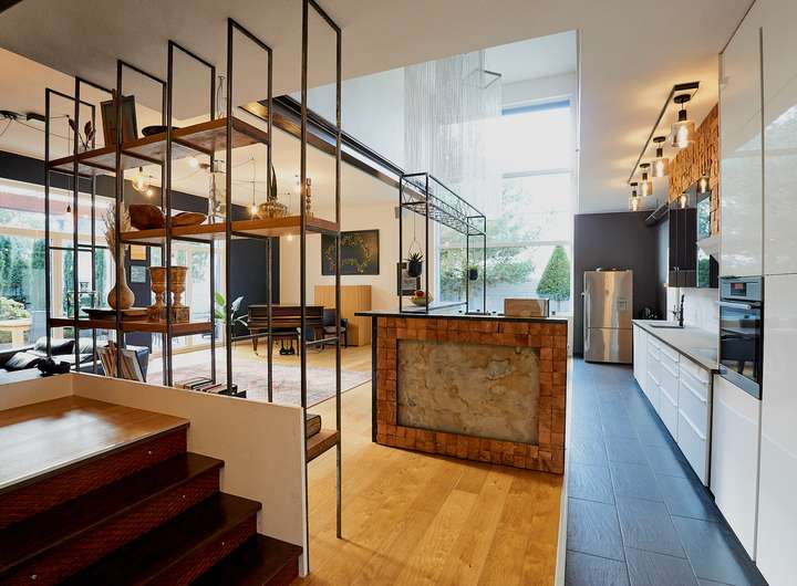 Der rund 100 m² große Wohn- und Essbereich bildet das Herz des Hauses: lichtdurchflutet, offen gestaltet und mit einer beeindruckenden Raumhöhe von bis zu 6 m in der Galerie. Eine elegante Café-Bar setzt gestalterische Akzente und macht den Raum zu einem echten Highlight.