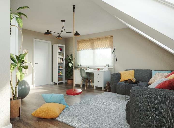 Über den offen gestalteten Treppenaufgang gelangen Sie ins Obergeschoss. Hier erwarten Sie ein Badezimmer und drei großzügige Zimmer. Die ideale Raumaufteilung lässt Ihnen viele Möglichkeiten Ihre Gestaltungswünsche umzusetzen. Unter dem Dach bietet Ihnen das Studio den perfekten Platz für Hobby, Arbeit oder Gäste. Besonders praktisch ist auch der Abstellraum.