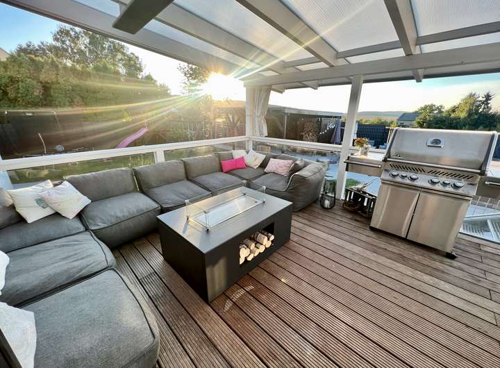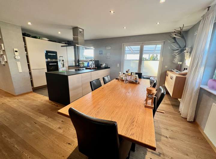 - Offen gehaltener Wohn-Koch-Essbereich mit Zugang zur über 24 qm großen überdachen Terrasse und in den Garten und mit Kamin