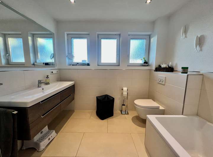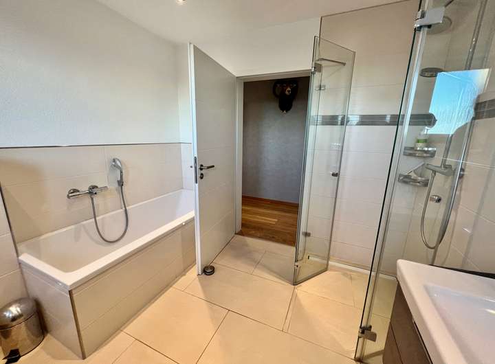 - Tageslichtbad mit bodentiefer Rain-Shower-Dusche und mit Glas-Duschkabine, Doppelwaschtisch und Badewanne