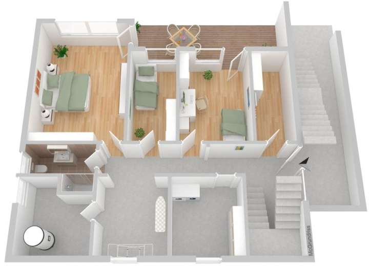 Das Haus besteht aus einem Untergeschoss, einem Erdgeschoss sowie einem ausgebauten Dachgeschoss. Das Erd- und Untergeschoss bietet jeweils einen eigenen Eingangsbereich, sodass die Etagen auch voneinander getrennt als „Generationshaus“ genutzt werden könnten.