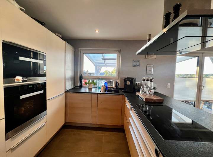 - Vollständig eingerichtete Einbauküche mit allen Elektrogeräten und Induktions-Kochfeld (Miele-Geräte)