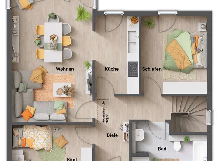 Ihr Haus wird schlüsselfertig übergeben, d.h. Sie gestalten nur noch die Innenwände in Ihrer Lieblingsfarbe und verlegen die übrigen Bodenbeläge!
