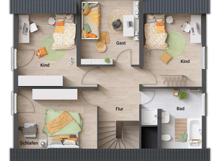 Ihr Haus wird schlüsselfertig übergeben, d.h. Sie gestalten nur noch die Innenwände in Ihrer Lieblingsfarbe und verlegen die übrigen Bodenbeläge!
