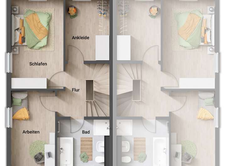 Eine Doppelhaushälfte bietet Ihnen die Vorteile eines normalen Einfamilienhauses, benötigt aber weniger Grundstücksfläche. Die effiziente Raumaufteilung des Doppelhaus Mainz tut ihr Übriges dazu: Im Erdgeschoss erstreckt sich das geräumige Wohnzimmer mit genügend Platz für Entspannung und Familienaktivitäten. Mit einem schönen Esstisch machen Sie das Wohnzimmer zum zentralen Treffpunkt mit Ihren Lieben. Die bodentiefen Fenster verwöhnen Sie mit angenehmen Tageslicht und einem Blick ins Grüne.