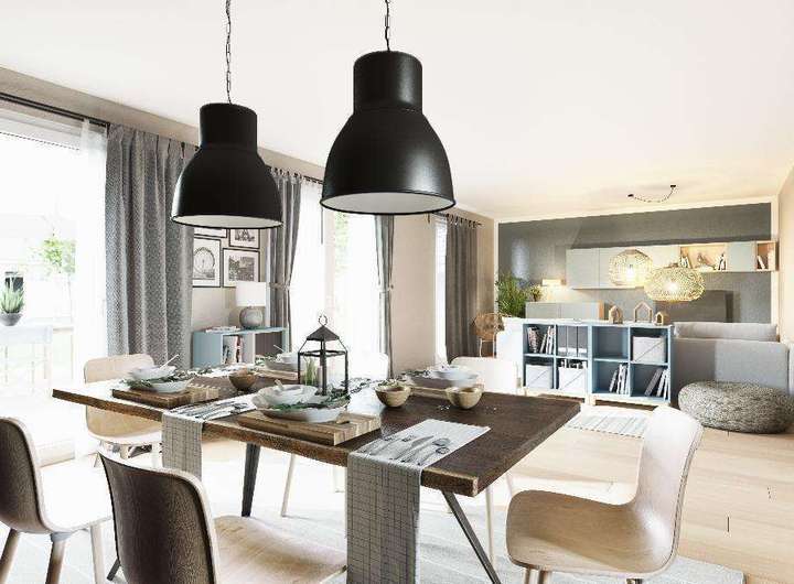 Ein offener Wohn- & Essbereich im Erdgeschoss ist der Mittelpunkt des Edition Clever 138+. Hier trifft sich die ganze Familie zu einem Sonntags-Frühstück oder einem Fernsehabend. Eine große Küche bietet genug Platz zum gemeinsamen Kochen. Bodentiefe Fenster sorgen dabei für Helligkeit und dienen auch als Zugang zur Terrasse und zum Garten.