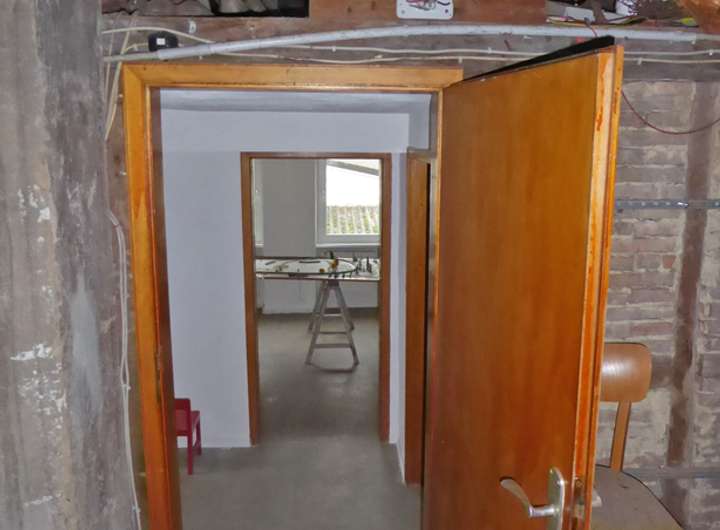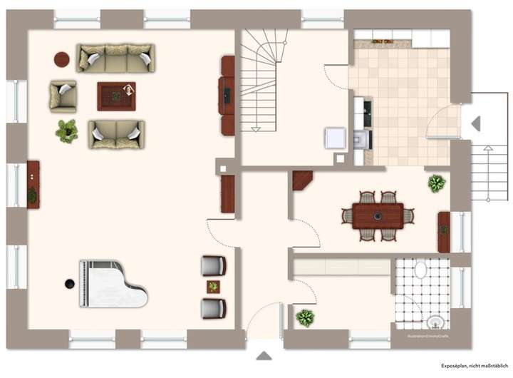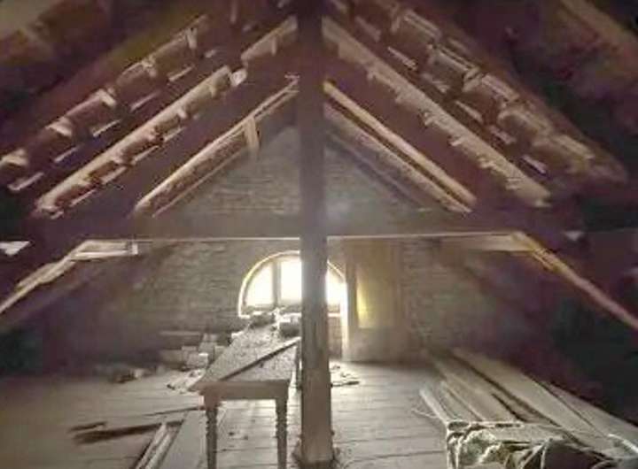 EG: Eingangsbereich, großer Saal, Küche, Raum mit Durchgang zum WC/Waschbecken, Aufgang ins Dachgeschoss (teilweise ausgebaut) sowie Spitzboden, insgesamt ca. 118 m² Wohn-/Nutzfläche.