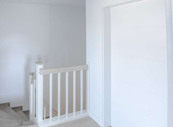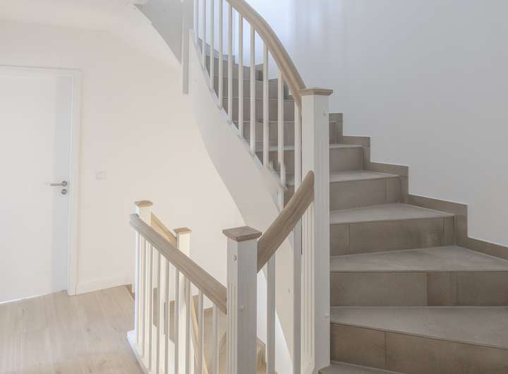Über eine Treppe mit Feinsteinzeug belegt, kommen Sie in das Obergeschoss des Hauses, welches über drei gut dimensionierte und teilweise mit bodentiefen Fenstern versehene Schlafzimmer sowie das Masterbad verfügt.