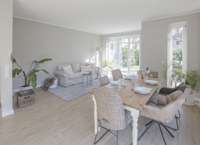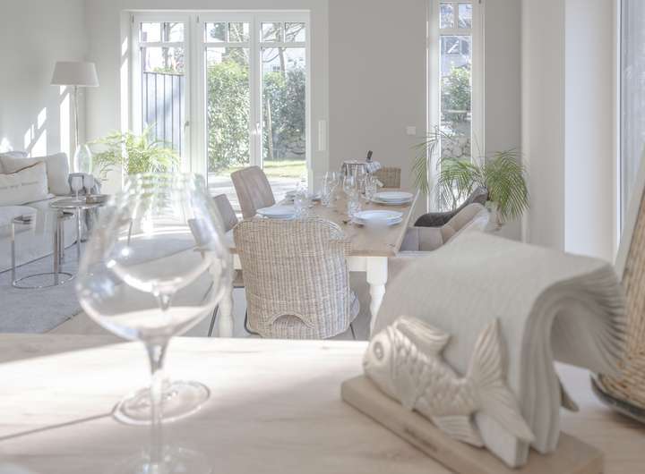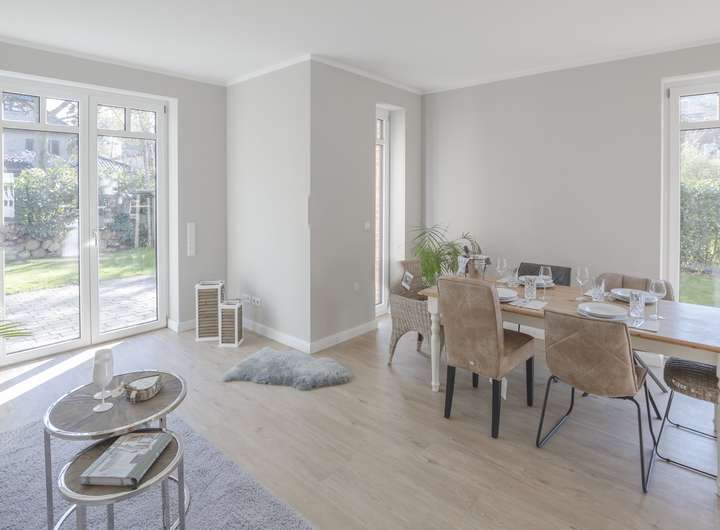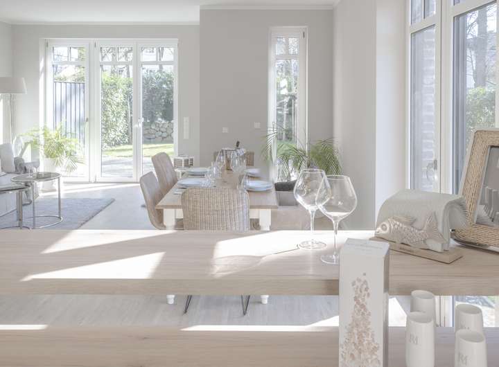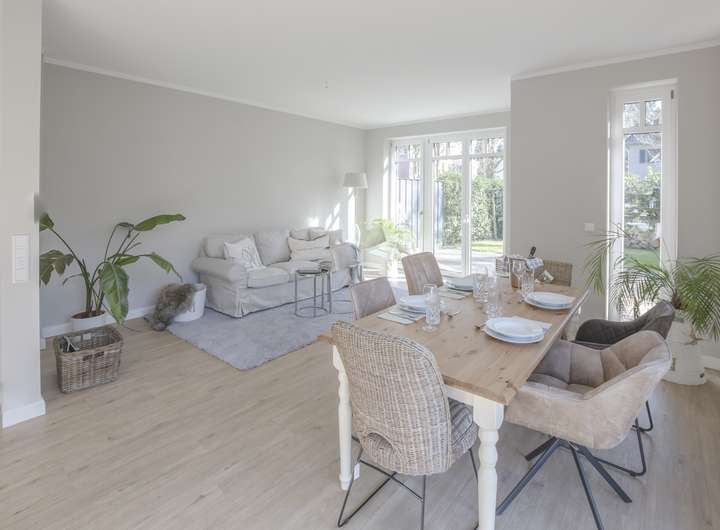 Lichtdurchflutet ist das Wohnzimmer, das durch die bodentiefen Fenster sowohl herrliche Ausblicke, wie auch der Zugang auf die schöne Terrasse und den liebevoll angelegten Garten gewährt.