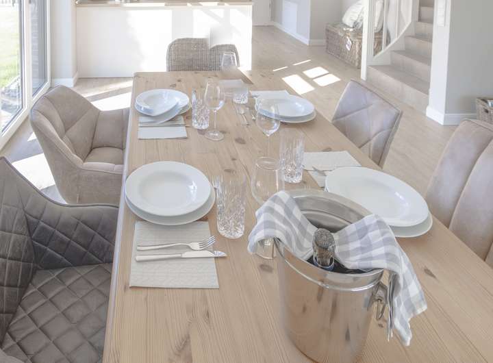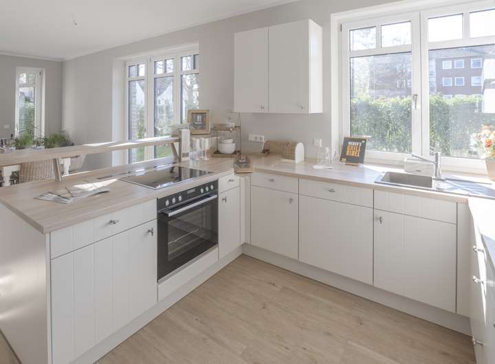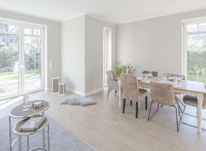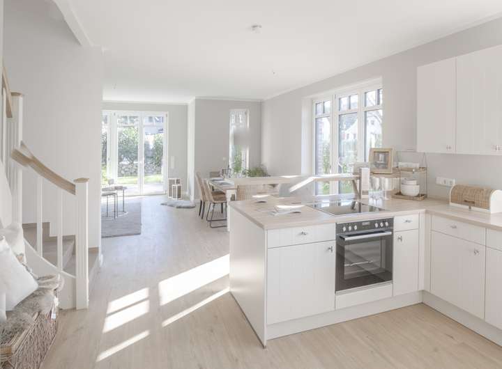 Im Erdgeschoss befindet sich der Eingangs-/Flurbereich mit viel Stauraum für die Garderobe und die Dinge des Alltags, auf die man schnell zugreifen möchte, ein Gäste-WC sowie der Hauswirtschaftsraum für Technik, Waschen und Vorräte. Angrenzend gelangt man in die moderne, edel ausgestattete Einbauküche mit hochwertigen Markengeräten, in der durch die offene Gestaltung zum Wohn- und Essbereich hin, gemeinsame Kochabende mit Familie oder Freunden möglich sind. Ein kleiner Tresen trennt den Küchenbereich vom Essbereich.