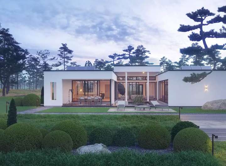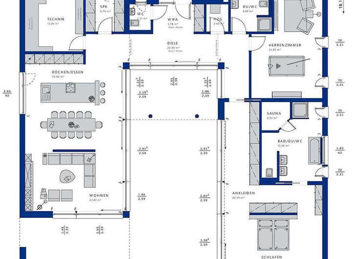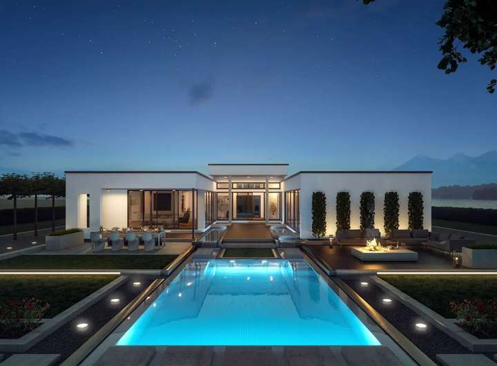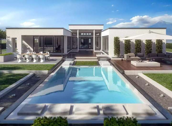 Bei der Gestaltung des Innenhofs können die Bauherren ihren Ideen freien Lauf lassen: Geschützt vor fremden Blicken bietet sich die Fläche beispielsweise für einen großen Pool inklusive Relaxbereich an.