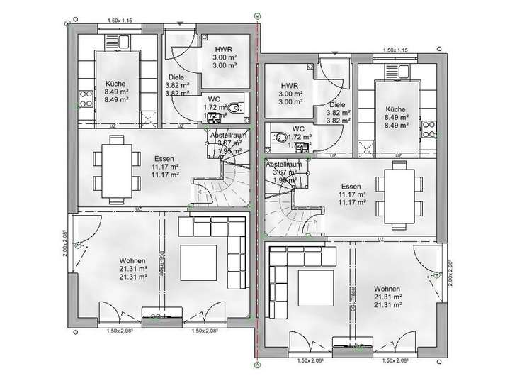Insgesamt werden auf dem ca. 1580,00 m² großen Grundstück 2 Reihenhäuser und 1 Doppelhaus realisiert.
