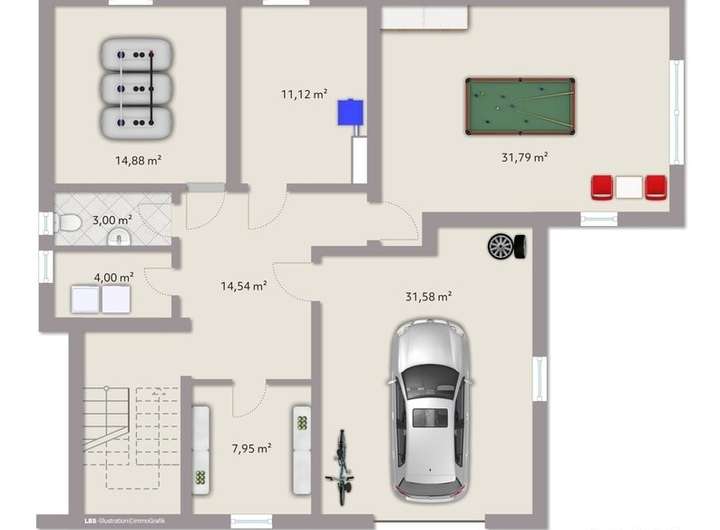 Im Untergeschoss befindet sich die Garage, Lagerräume, WC, Waschküche, Heizungsraum mit Tankraum und ein großer Hobbyraum mit Terrasse.
