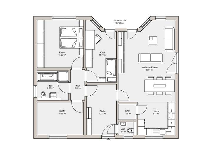 3 Zimmer, offene Küche, Speisekammer, Diele, WC, Flur, Bad, Hauswirtschaftsraum, überdachte Terrasse