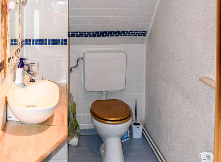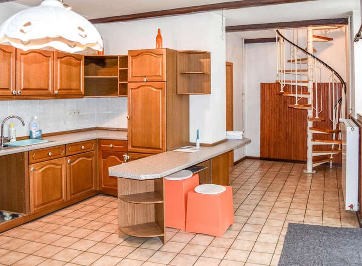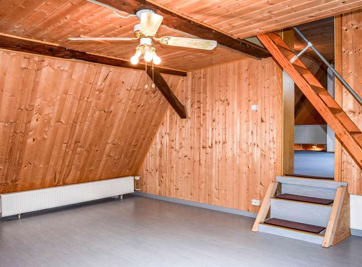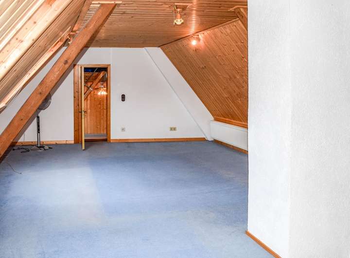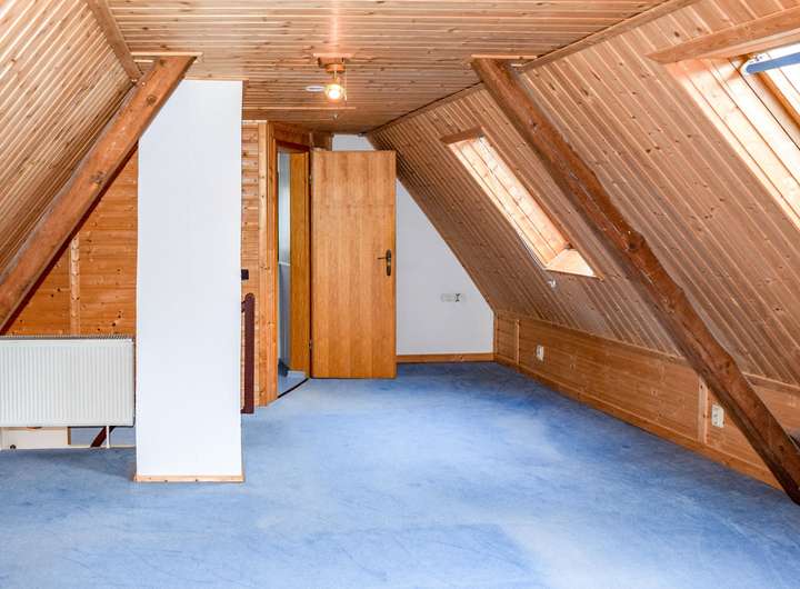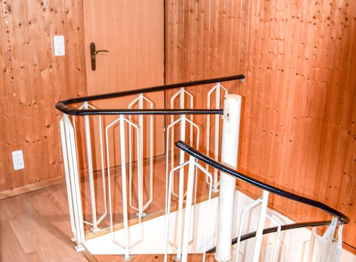 Das Erdgeschoss bietet im Eingangsbereich eine Küche mit Essbereich und Abstellkammer sowie ein Duschbad. Über eine Wendeltreppe gelangt man in das Obergeschoss, welches ein Schlafzimmer und einen Flurbereich bereit hält. Von diesem kommt man auch zur überdachten Außentreppe die zum abgegrenzten Terrassenbereich führt. Weiter geht es von dort über eine Treppe in das ausgebaute und gedämmte Dachgeschoss. Hier gibt es eine Toilette, ein Wohnzimmer und ein dahinter gelegenes Zimmer mit Zugang zum Speicher. Zusätzlich ist das Haus teilweise unterkellert und wurde 2024 mit einer neuen Gas-Zentralheizung ausgestattet. Zum Teileigentum des Hauses gehören ca. 117 m² Grundstücksfläche, die gesamte Grundstücksgröße beträgt 954 m².