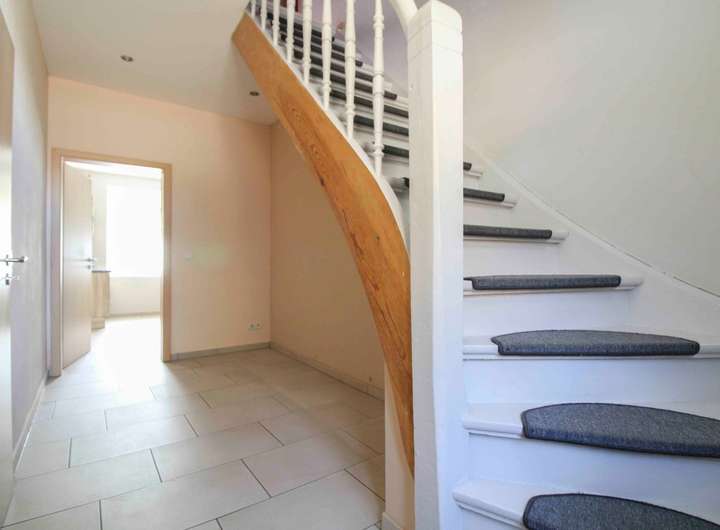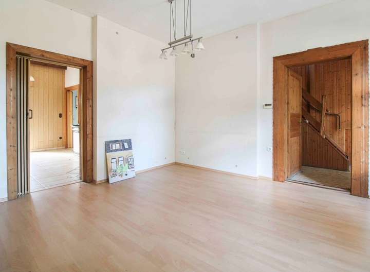 Die rechte Haushälfte ist sanierungsbedürftig und bietet viel Raum für eigene Gestaltungsideen. Sie kann als eigenständige Wohneinheit genutzt oder mit der linken Haushälfte verbunden werden – so entstünde eine große Einheit mit ca. 180 m² Gesamtwohnfläche. Diese Hälfte bietet direkten Zugang zum Garten sowie zwei Kellerräume.