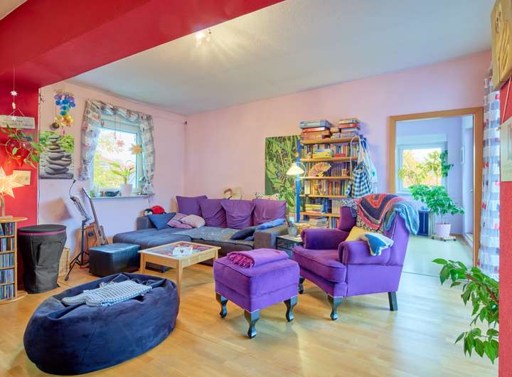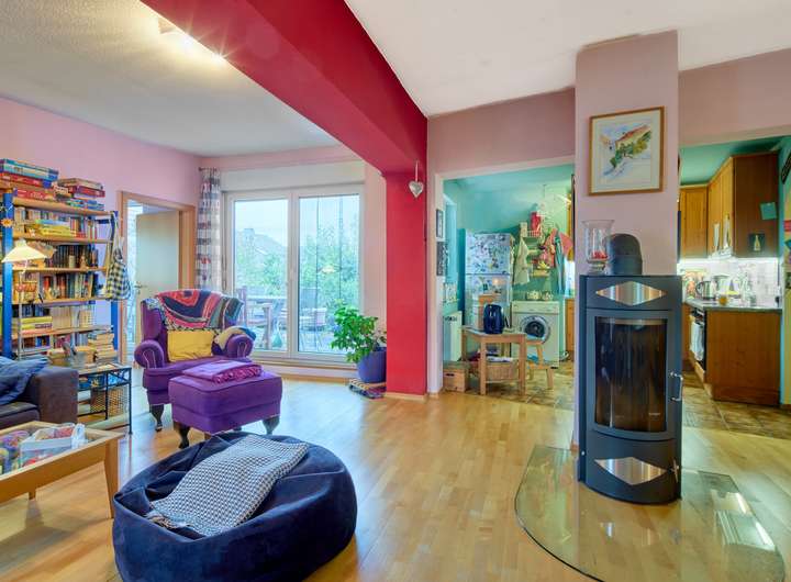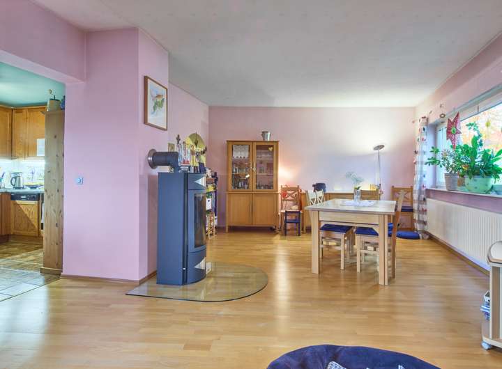 Über die Treppe erreichen Sie den Hauptwohnbereich des Hauses. Dieser überzeugt durch einen lichtdurchfluteten Wohn- und Essbereich, der viel Platz für Familie und Freunde bietet. Hier befindet sich ebenfalls ein Kaminofen, für gemütliche Stunden in der kalten Jahreszeit. Vom Wohnraum aus haben Sie direkten Zugang zur großzügigen Terrasse und zum Garten, der zu entspannten Stunden im Freien einlädt.