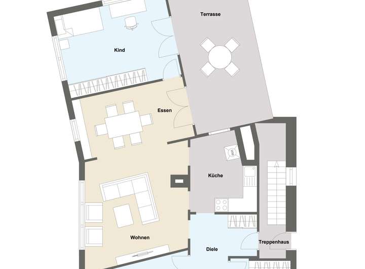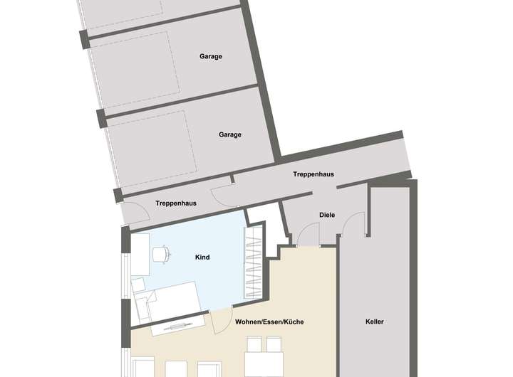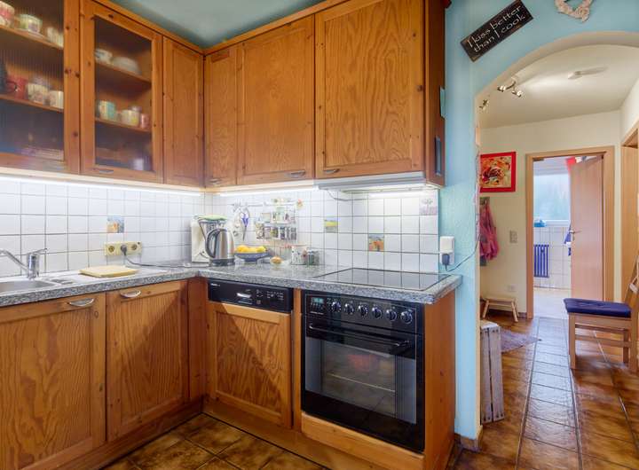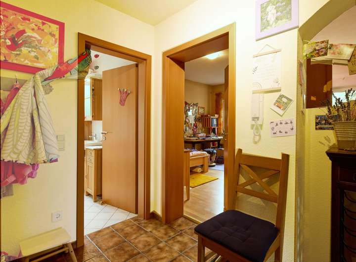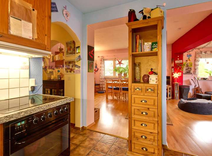 Vom Eingangsbereich aus gelangen Sie auf der rechten Seite in eine gemütliche Dreizimmerwohnung mit offen gestalteter Küche und innenliegendem Duschbad – ideal als separate Wohneinheit oder für Gäste.