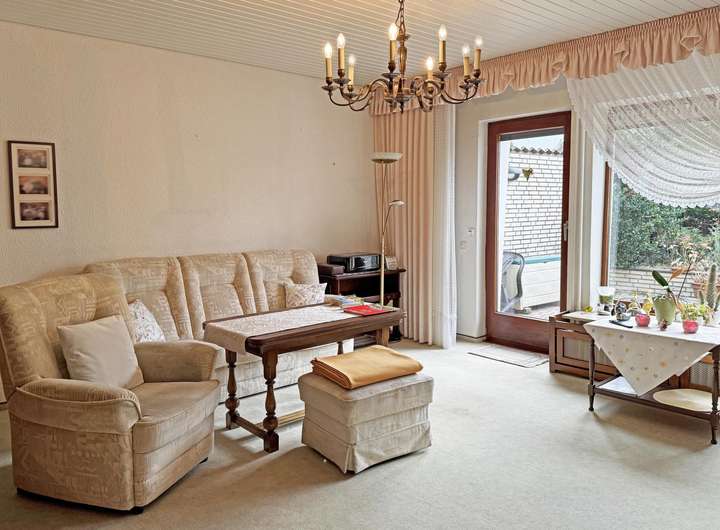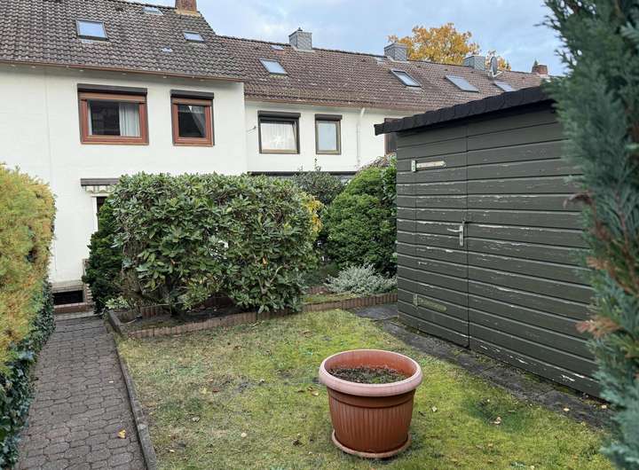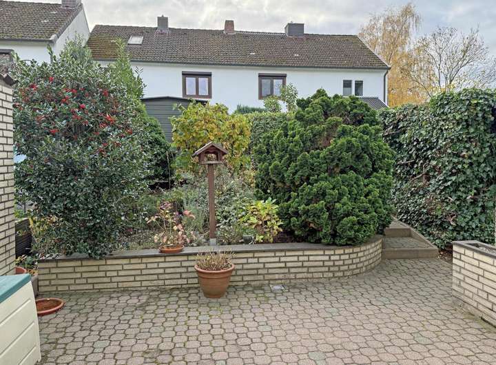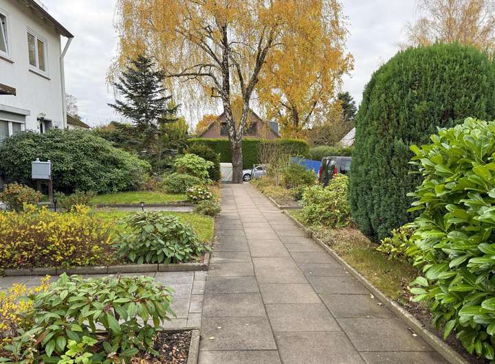Vom lichtdurchfluteten, ca. 24 m² großen Wohnzimmer gelangen Sie auf die sonnige Terrasse mit Markise und in den pflegeleicht angelegten Garten. Im hinteren Bereich befindet sich ein Gartenhaus. Die Küche ist mit einer Einbauküche möbliert und bietet zudem Platz für einen Esstisch. Das Gäste-WC vervollständigt das Raumangebot im Erdgeschoss.