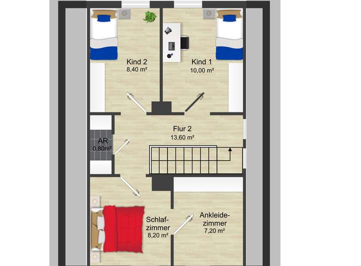 Im Dachgeschoss setzt sich die funktionale Gestaltung fort. Ein weiterer Flur verbindet die Räume miteinander: Neben einem praktischen Abstellraum finden Sie hier zwei Kinderzimmer, die sich ideal als Schlaf- oder Spielräume eignen, sowie das Elternschlafzimmer mit angrenzender Ankleide.