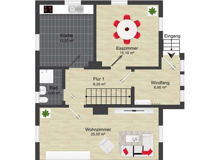 Das Einfamilienhaus bietet ausreichend Platz für die ganze Familie. Im Erdgeschoss empfängt Sie ein praktischer Windfang, der in den ersten Flur übergeht. Von hier aus gelangen Sie in das helle Esszimmer, das Bad sowie in die gemütliche Küche. Der großzügige Wohnbereich lädt zum Entspannen und zu gemeinsamen Stunden ein.