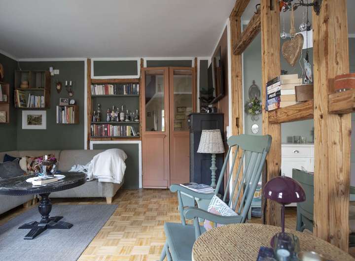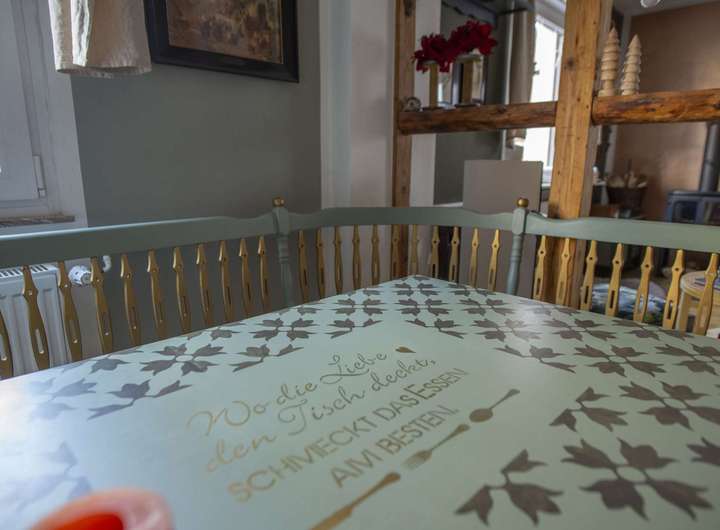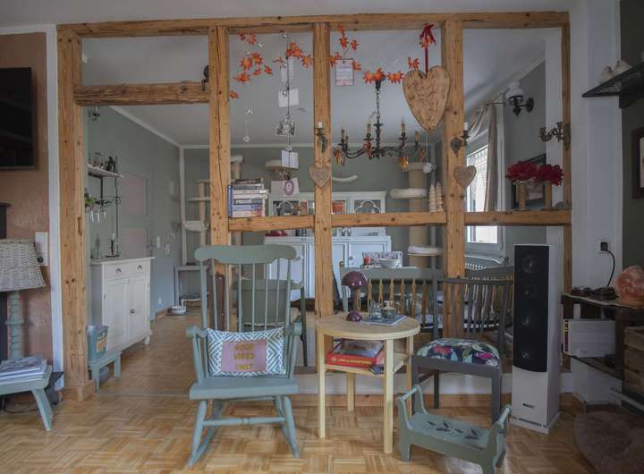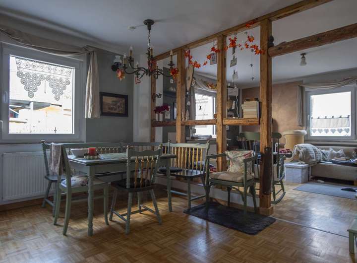 Großer Wohn-/Essbereich mit Fachwerk-Raumteiler und Kaminofen.