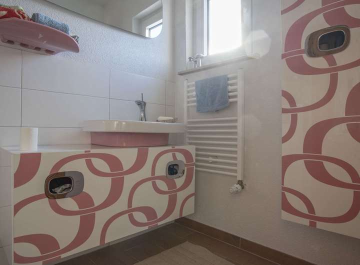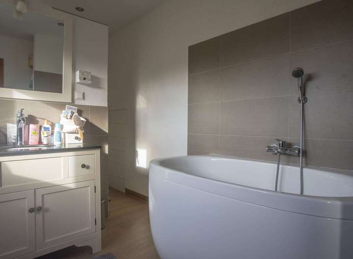 Tageslicht-Bad mit Badewanne, bodengleicher Dusche, Waschtisch und WC.