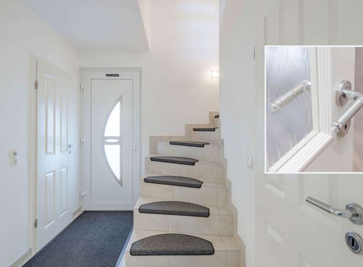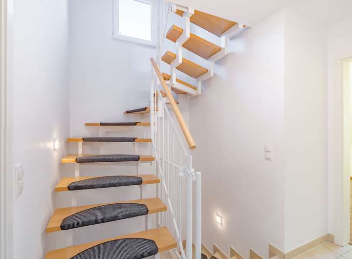 Die Doppelhaushälfte besticht durch einen durchdachten Grundriss und eine freundliche Atmosphäre. Der seitliche Eingang führt direkt in den Flur, der als zentraler Verteiler dient. Angrenzend befinden sich ein praktisches Gäste-WC, ein Heizraum sowie ein Abstellraum unter der offenen Treppe, die ins Obergeschoss führt.