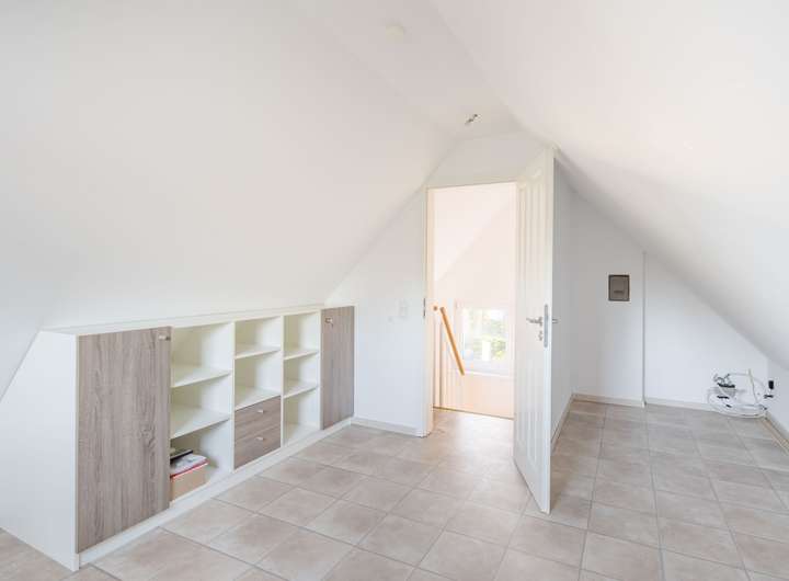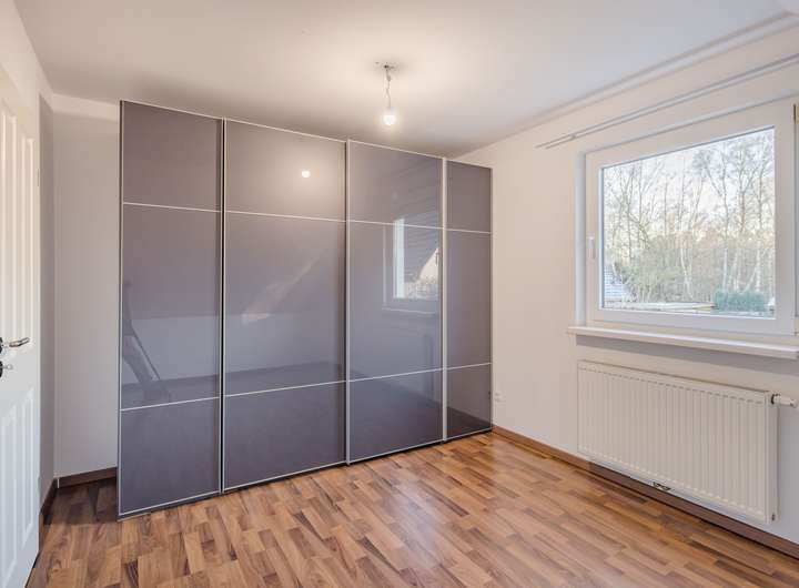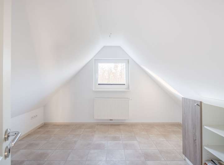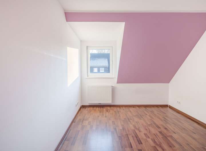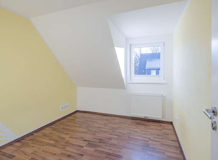 Die Zimmer unter den leichten Dachschrägen strahlen eine behagliche Atmosphäre aus und dienen als Schlafzimmer / Kinderzimmer. Durch die Fenster eröffnet sich ein idyllischer Blick über die angrenzenden Nachbargärten, der die Räume mit Licht durchflutet und