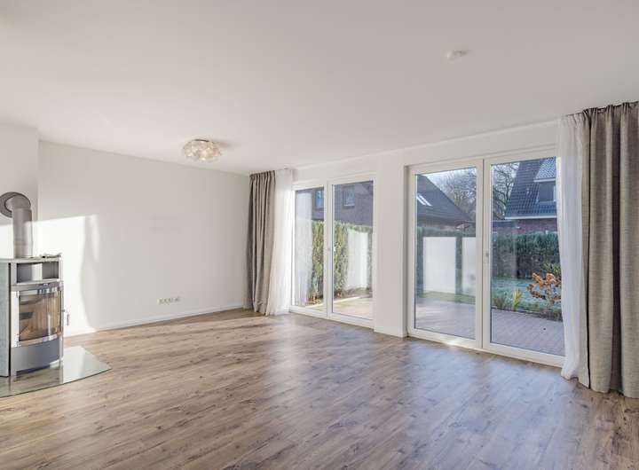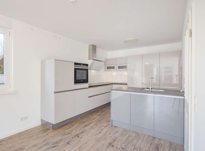Ein Highlight ist die große Fensterfront nach Süden, die den gesamten Wohnbereich mit Licht durchflutet. Sie bietet zudem Zugang zur Terrasse und dem Garten, wodurch der Wohnraum optisch erweitert wird und eine harmonische Verbindung zum Außenbereich entsteht. Die offene Küche (+ Halbinselmit Spüle) ist ideal in den Wohnbereich integriert und sorgt für kurze Wege sowie ein kommunikatives Wohnambiente.