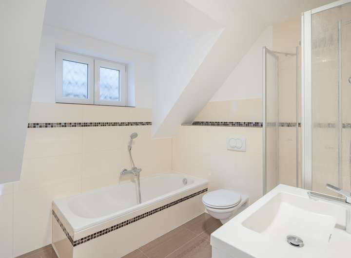 Im Obergeschoss der Doppelhaushälfte erwarten Sie drei gemütliche Zimmer sowie ein großzügiges, modern ausgestattetes Vollbad. Das Badezimmer verfügt über eine separate Dusche und eine komfortable Badewanne, wodurch es sowohl für schnelle Alltagsroutinen als auch für entspannende Auszeiten ideal geeignet ist.