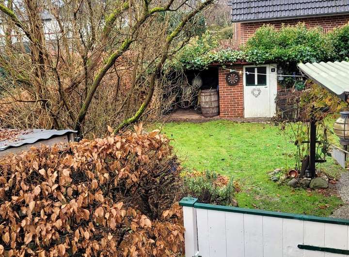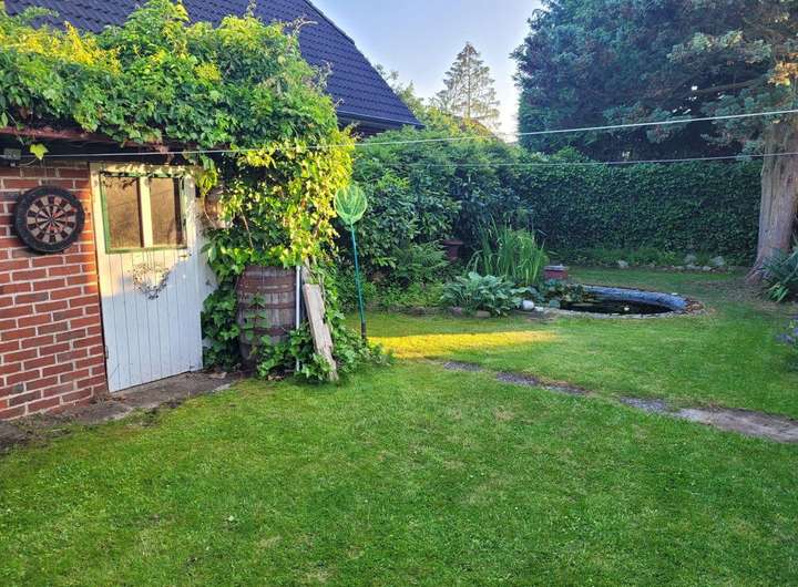Neben dem Wohnhaus gehört ein Geräteschuppen zum Anwesen. Der kleine Garten mit Teich bietet zahlreiche Nutzungsmöglichkeiten - sei es zum Spielen, Gärtnern oder einfach als Rückzugsort zum Entspannen.