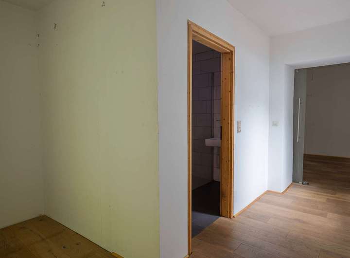 Ein Badezimmer ist vorhanden, jedoch noch nicht fertiggestellt. Eine Küche ist aktuell nicht eingebaut, sämtliche Anschlüsse sind vorhanden.