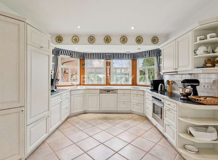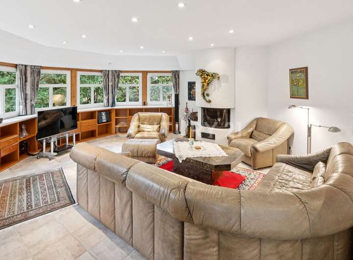 Der lichtdurchflutete Wintergarten mit Blick ins Grüne, zwei charmante Holzbalkone, ein behaglicher Kamin sowie die hochwertige Bang & Olufsen-Audioanlage, die sich durch das gesamte Haus zieht, sorgen für ein Wohngefühl auf höchstem Niveau.