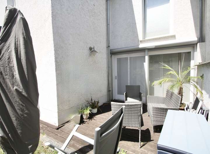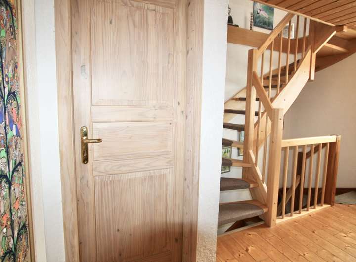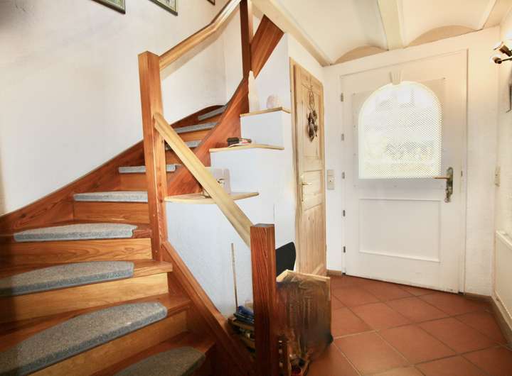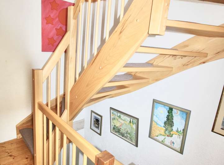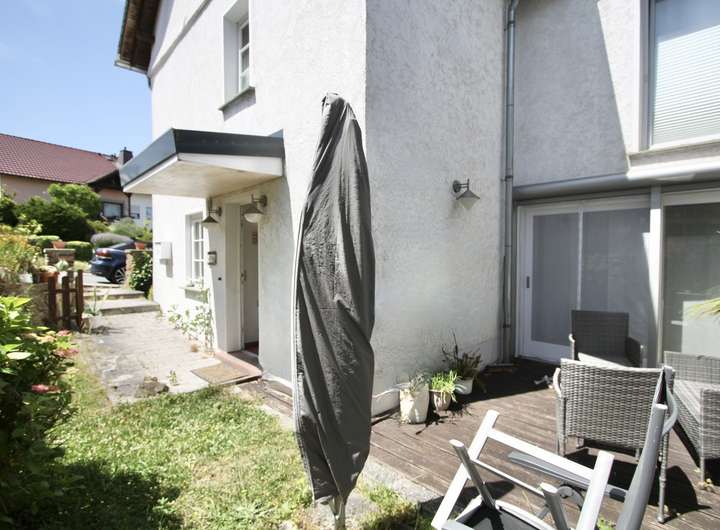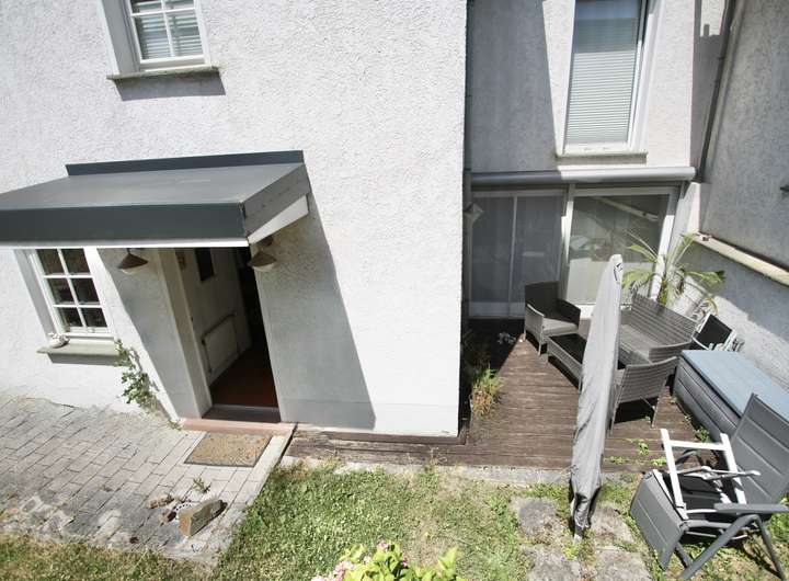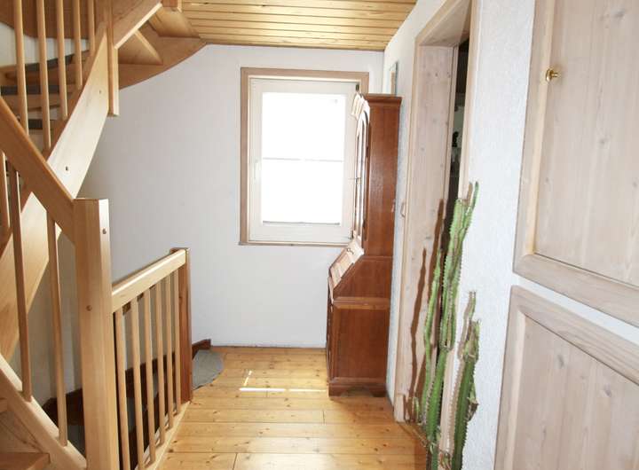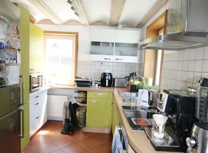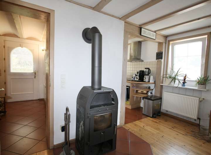 Im Erdgeschoss befindet sich der einladende Wohn- und Essbereich mit Holzdielenboden und Kaminofen - das Herzstück des Hauses. Die moderne Einbauküche stammt aus dem Jahr 2017 und ist voll ausgestattet. Von hier aus gelangt man direkt auf die geschützte Terrasse...ein ruhiger, uneinsehbarer Ort zum Entspannen.