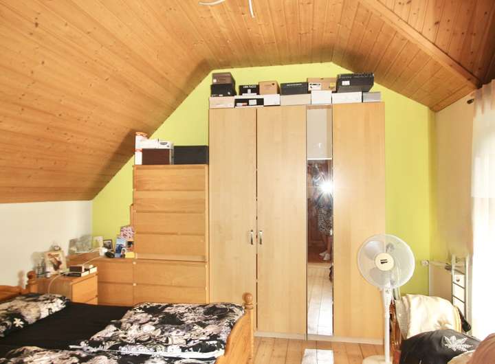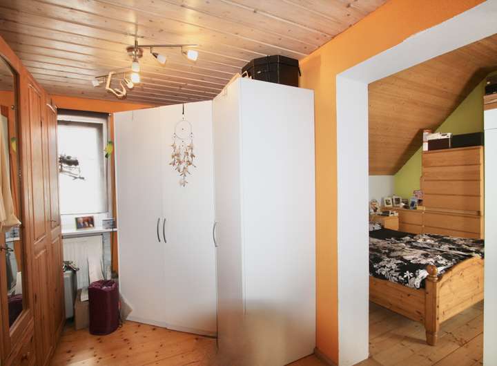 Das Obergeschoss bietet ein großzügiges Schlafzimmer mit separater Ankleide, ein weiteres Zimmer (ideal als Büro oder Kinderzimmer) sowie ein modernes Tageslichtbad mit Badewanne und Dusche.