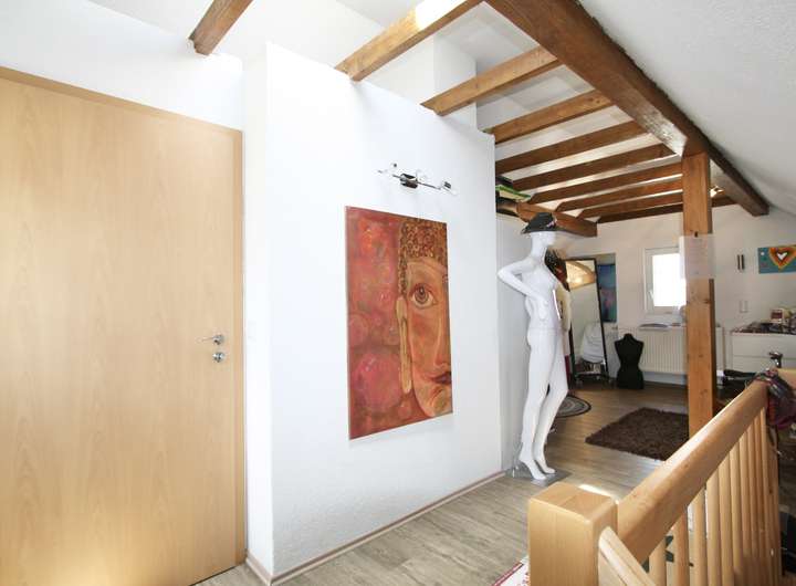Im ausgebauten Dachgeschoss befindet sich ein großes Studiozimmer mit eigenem Duschbad - ideal als Rückzugsort, Gäste- oder Arbeitsbereich.