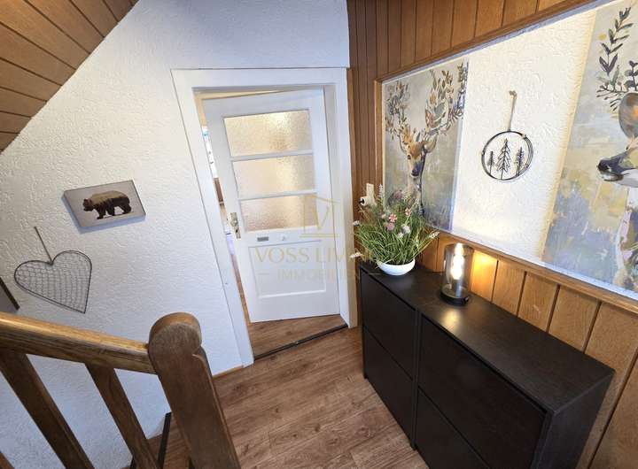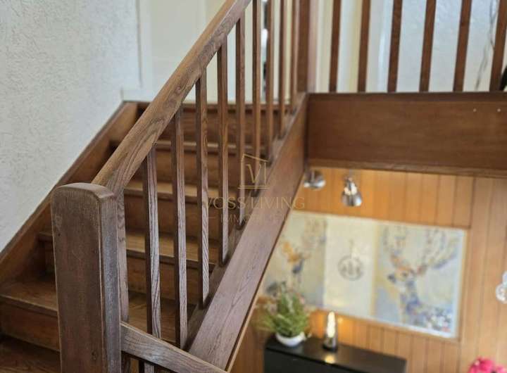 Hochwertiger Landhaus Echtholzdielen und die schöne dunkel gebeizte Echtholz Treppe sowie stilvolle Kassettentüren verleihen dem Haus eine wohnliche und einladende Atmosphäre.