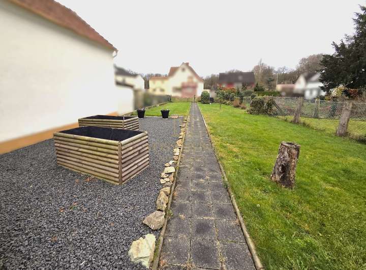 Der weitläufige Garten mit gepflastertem Zuweg, einem geschotterten Bereich (um z.B. die Hochbeete auch „trockenen Fußes“ zu erreichen) sowie dem Nebengebäude mit großzügiger Abstellfläche erleichtert den Alltag.