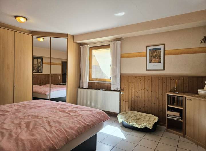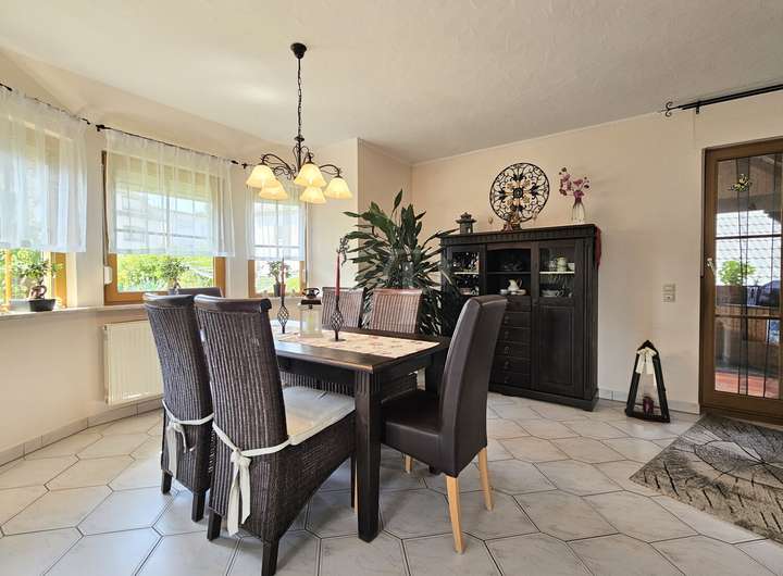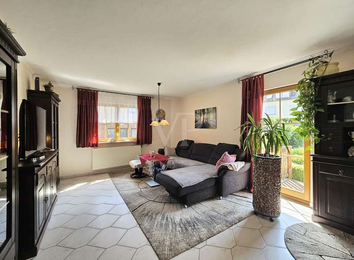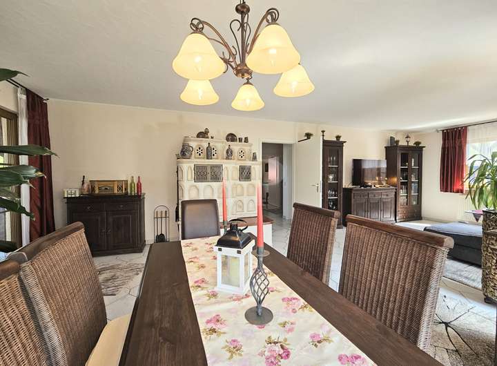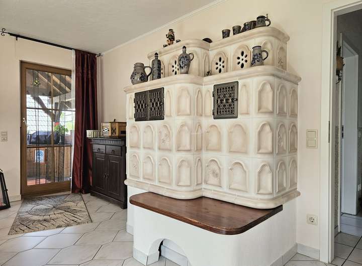 Die Hauptwohnung im Erdgeschoss bietet eine geräumige Küche mit angrenzendem Hauswirtschaftsraum und einer zusätzlichen Speisekammer. Der großzügige Wohn-Essbereich wird durch den Zugang auf die überdachte Terrasse und die Sonnenterrasse zum Garten hin erweitert. Im Wohnzimmer sorgt zudem ein großer, heller Kachelofen für behagliche Wärme.