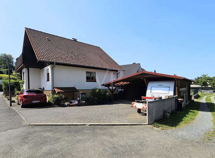 - ca. 50m² großer Carport mit Gerätehaus für 3 Fahrzeuge (auch für Wohnwagen geeignet) und drei weitere Stellplätze