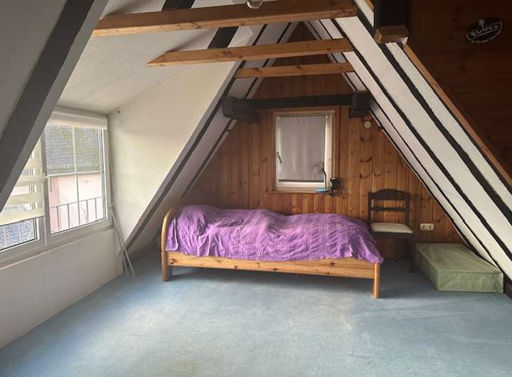Das gemütliche Dachgeschoss mit zwei Dachgauben ist ebenfalls über eine Holztreppe zu erreichen und bietet zusätzlichen Wohnraum mit angenehmer Atmosphäre.