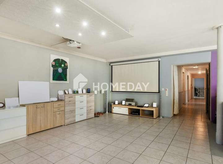 Die Immobilie hat eine Größe von circa 488 Quadratmetern Wohnfläche, die sich auf 20 Zimmer verteilt. Im Erdgeschoss befindet sich die größte Wohnung. Das Obergeschoss ist in 2 Wohnungen aufgeteilt. Im Dachgeschoss befinden sich aufgrund der Schrägen zwei kleinere Wohnungen. Das Haus präsentiert sich im Inneren mit normaler Ausstattung.