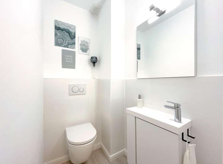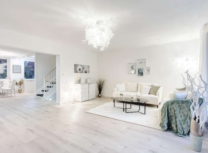 Im Inneren des Hauses öffnet sich der Eingangsbereich in eine große offene Küche mit Essplatz. Ein modernes, neues Gäste-Bad mit weißen, zeitlosen Fliesen und Hänge-WC befindet sich ebenfalls im vorderen Teil des Hauses. Die offene Küche samt Essplatz geht nahtlos in das lichtdurchflutete Wohnzimmer mit großen Glasfronten über.